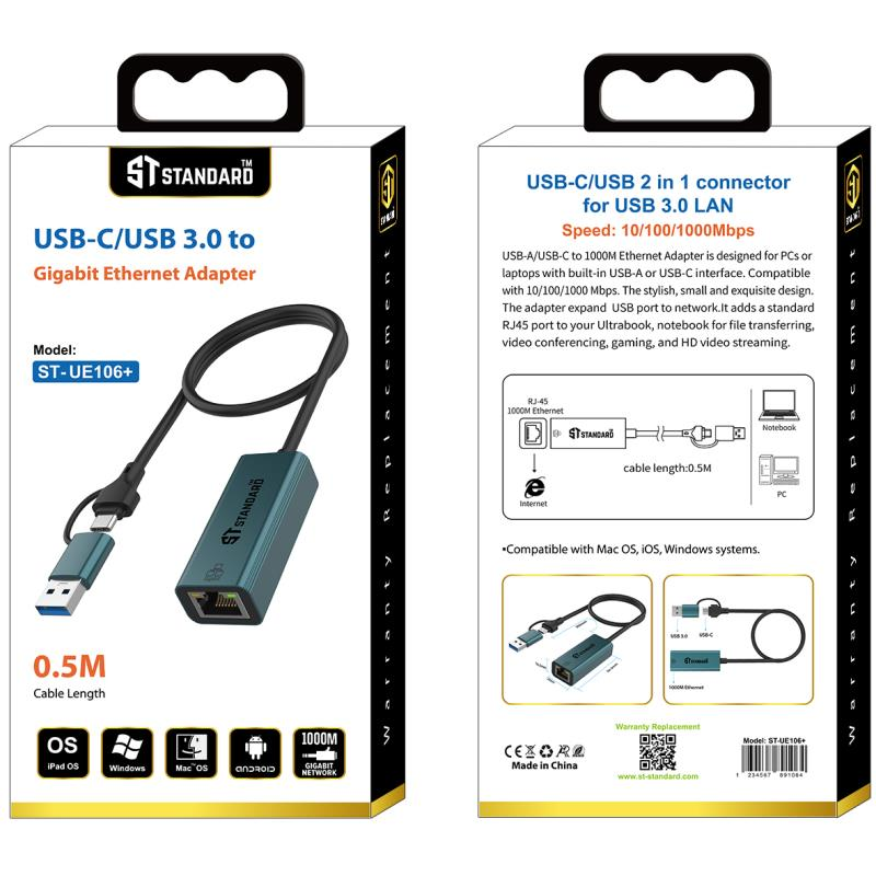 محول UE106 Plus هو الحل الأمثل لتوصيل أجهزة الكمبيوتر واللاب توب بشبكة الإنترنت السلكية بسرعة جيجابت 1000Mbps عبر منفذي USB-C أو USB 3.0. يتميز بتصميم معدني قوي، دعم كامل للتوصيل والتشغيل بدون أي تعريفات، وحماية داخلية ضد التيار الزائد. مناسب للأجهزة التي لا تحتوي على منفذ إيثرنت ويوفر اتصالاً ثابتًا وسريعًا لنقل البيانات، الاجتماعات، الألعاب، والبث.