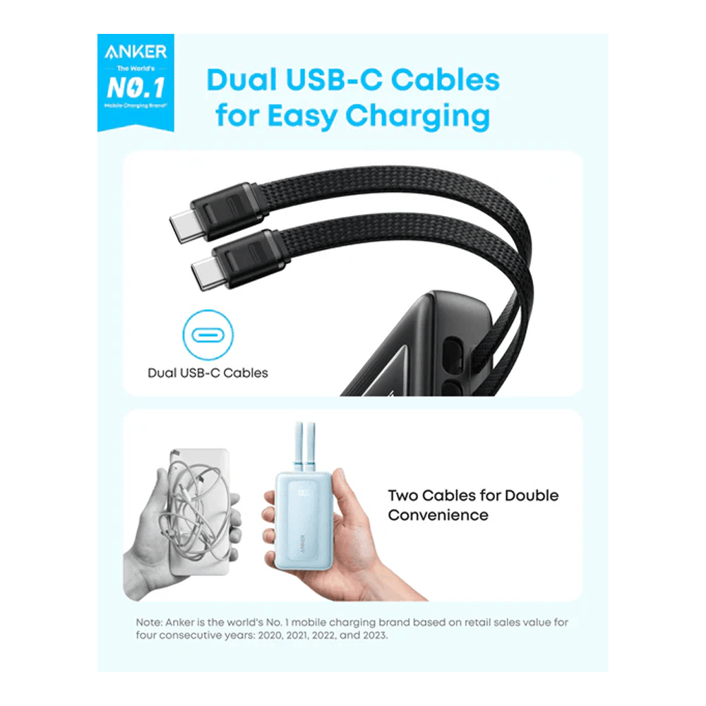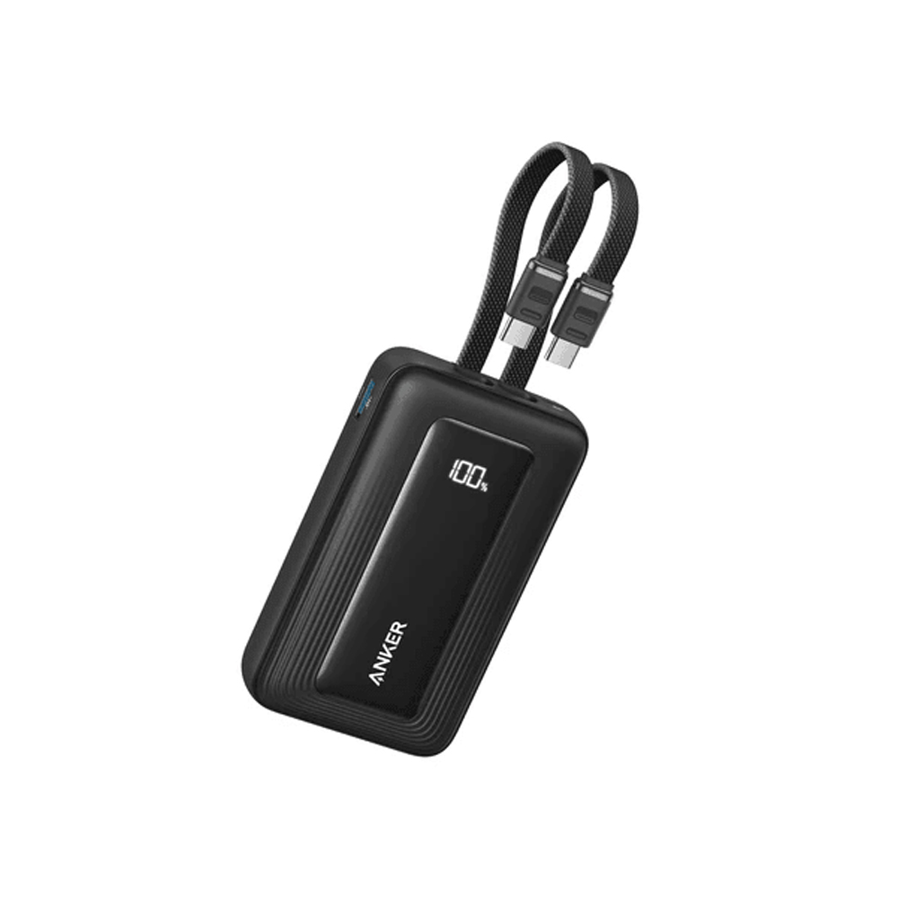 باور بانك Anker Zolo بسعة 10,000mAh مع كابلين USB-C مدمجين، شحن سريع بقوة 35 واط، وإمكانية شحن 4 أجهزة في نفس الوقت. تصميم خفيف ومثالي للسفر.