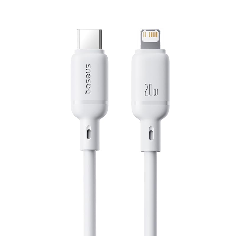 كابل شحن سريع من Baseus بمنفذ Type-C إلى Lightning يدعم 20 وات PD، يوفر شحن آمن وسريع مع نقل بيانات عالي السرعة.