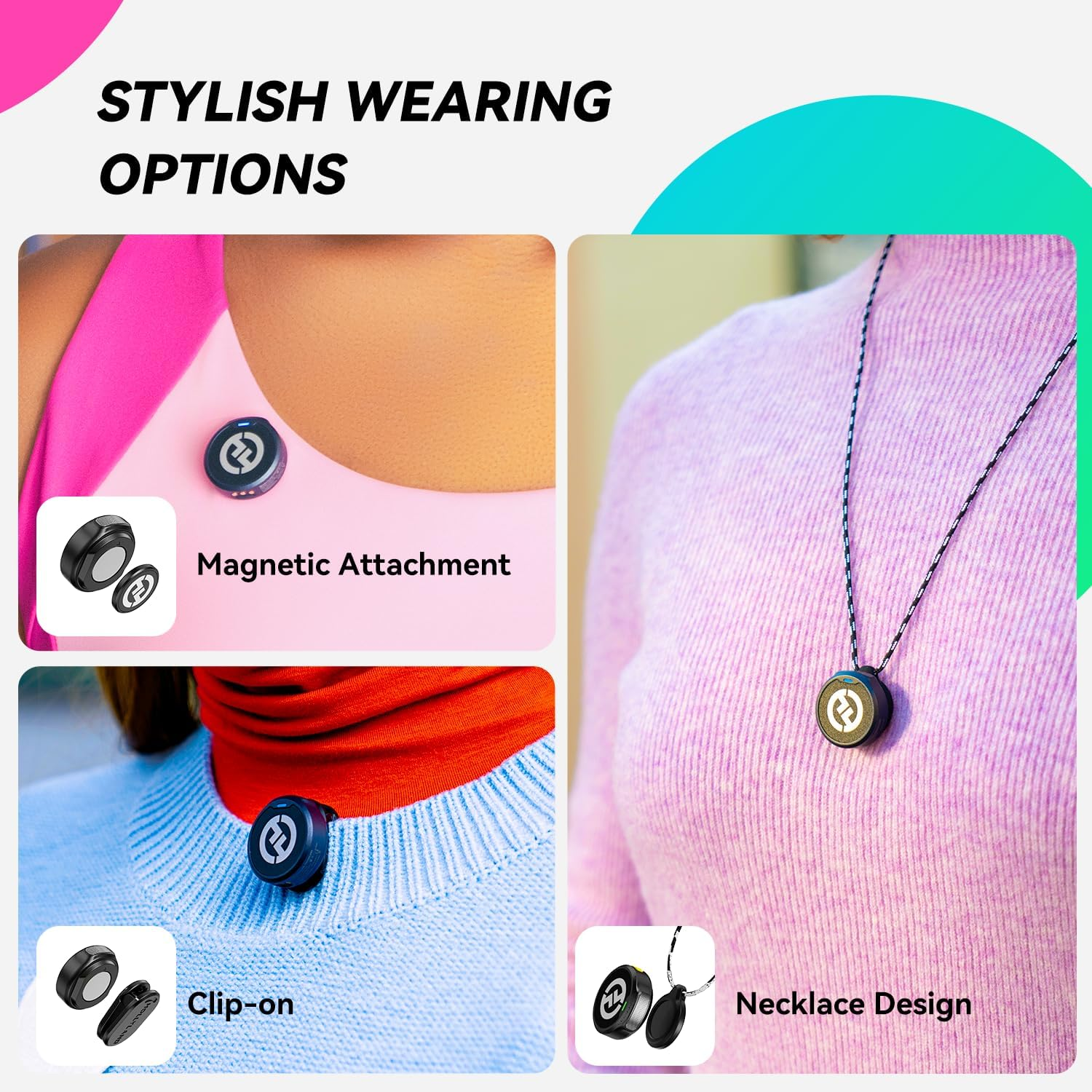 • مرونة في التثبيت: مشبك، مغناطيس، أو قلادة لارتداء مريح وتغيير الأسلوب بسهولة