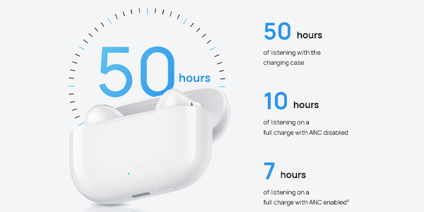 بطارية حتى 50 ساعة – 10 ساعات للسماعات + 40 ساعة مع العلبة
