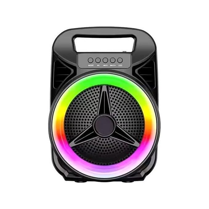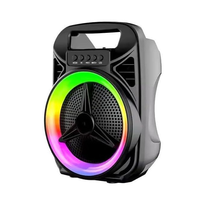 سماعة بلوتوث محمولة بصوت ستيريو قوي، إضاءة ملونة، دعم USB وكارت ميموري، وبطارية قابلة للشحن للاستمتاع بالموسيقى في أي مكان.