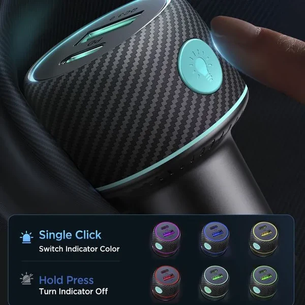 شاحن سيارة مزدوج المنافذ 60 واط من Joyroom مع زر إضاءة LED بـ 7 ألوان – شحن سريع PD & QC3.0