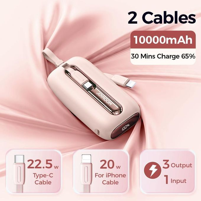 باور بانك صغير JOYROOM JR-L012 بقدرة 22.5 واط و10000 مللي أمبير مع كابلين مدمجينتمتع بالشحن السريع مع باور بانك JOYROOM JR-L012 بقدرة 22.5 واط. تصميمه الصغير والكابلات المدمجة ومنافذ الشحن الثلاثية تمكنك من شحن ثلاثة أجهزة في نفس الوقت. بسعة 10000 مللي أمبير، تحافظ على أجهزةك مشحونة طوال اليوم، بينما يعرض لك الشاشة الرقمية الذكية مستوى البطارية وحالة الشحن السريع.