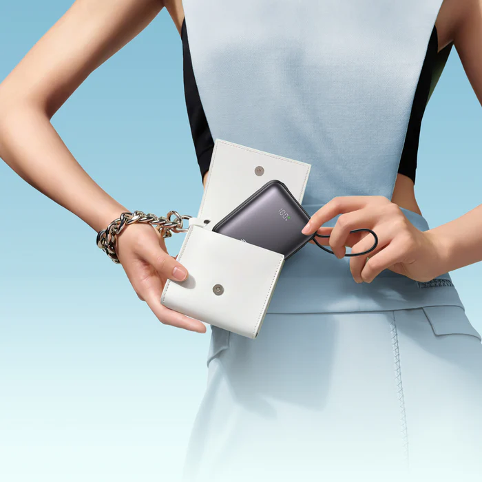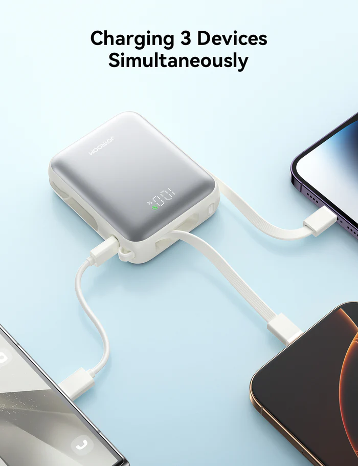 باور بنك Joyroom JR-PBF27 ميني 10000mAh شحن سريع 22.5W مع كابلات مدمجةباور بنك Joyroom JR-PBF27 يجمع بين الشحن السريع بقوة 22.5 واط والتصميم الصغير الميني الذي يأتي أصغر بنسبة 50% من الباور بانكات التقليدية. يحتوي على كابلين مدمجين (Type-C + Lightning) ليتوافق مع أجهزة آيفون وأندرويد بدون الحاجة لحمل كابلات إضافية. مزود بشاشة رقمية ذكية توضح مستوى البطارية وحالة الشحن السريع، بالإضافة إلى 3 مخارج شحن وبطارية 10000mAh تمنحك شحن يصل إلى مرتين للهاتف.