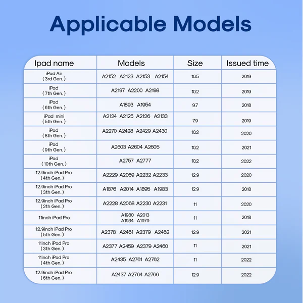 • التوافق: iPad mini 5/6 – iPad 6/7/8/9 – iPad Air 3/4/5 – iPad Pro 11 بوصة – iPad Pro 12.9 بوصة