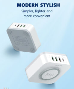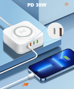 شاحن LDNIO AW004 هو محطة شحن مكتبية 5 في 1 تجمع بين الشحن اللاسلكي السريع ومنافذ USB المتعددة. بقدرة إجمالية تصل إلى 32 واط، يمكنك شحن حتى 5 أجهزة في وقت واحد بسهولة وكفاءة. مثالي للاستخدام في المنزل أو المكتب.