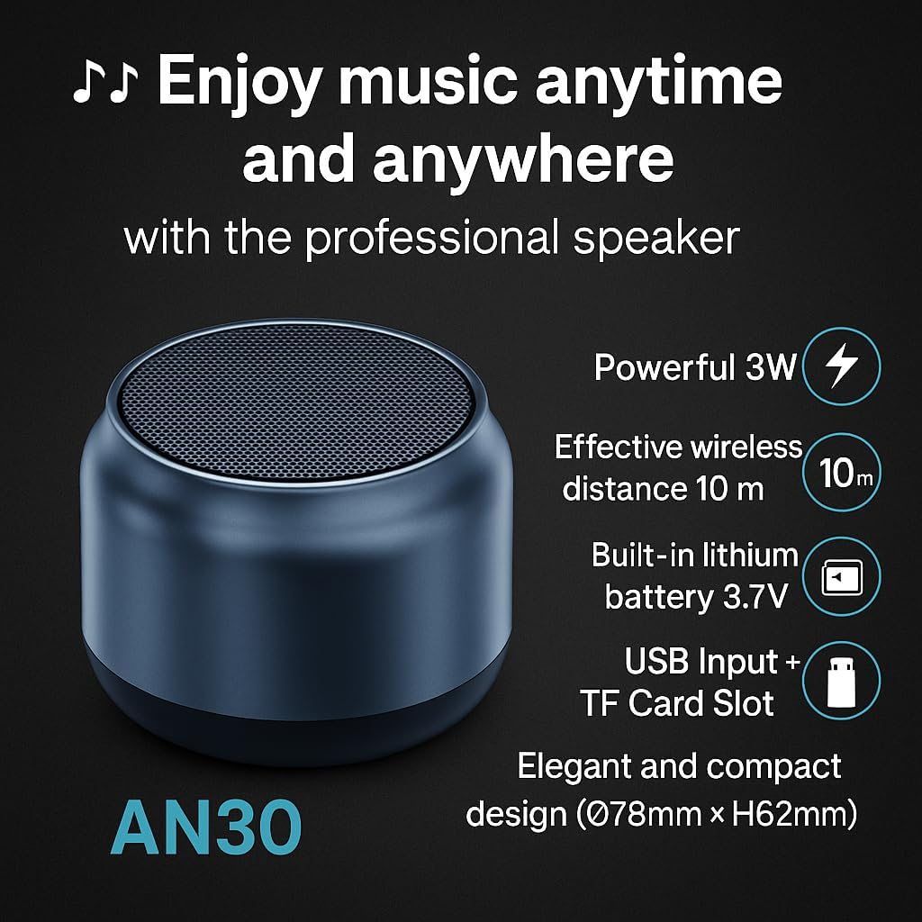استمتع بالموسيقى في أي مكان مع BDT AN30 Portable Wireless Bluetooth Speaker. تقدم هذه السماعة الصغيرة صوت ستيريو واضح، واتصال بلوتوث مستقر، وخيارات تشغيل متعددة، مما يجعلها مثالية للاستخدام اليومي والسفر.