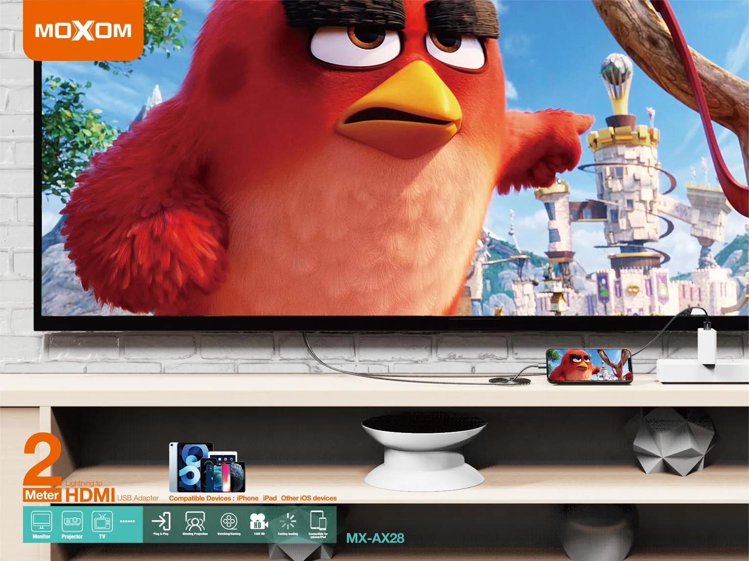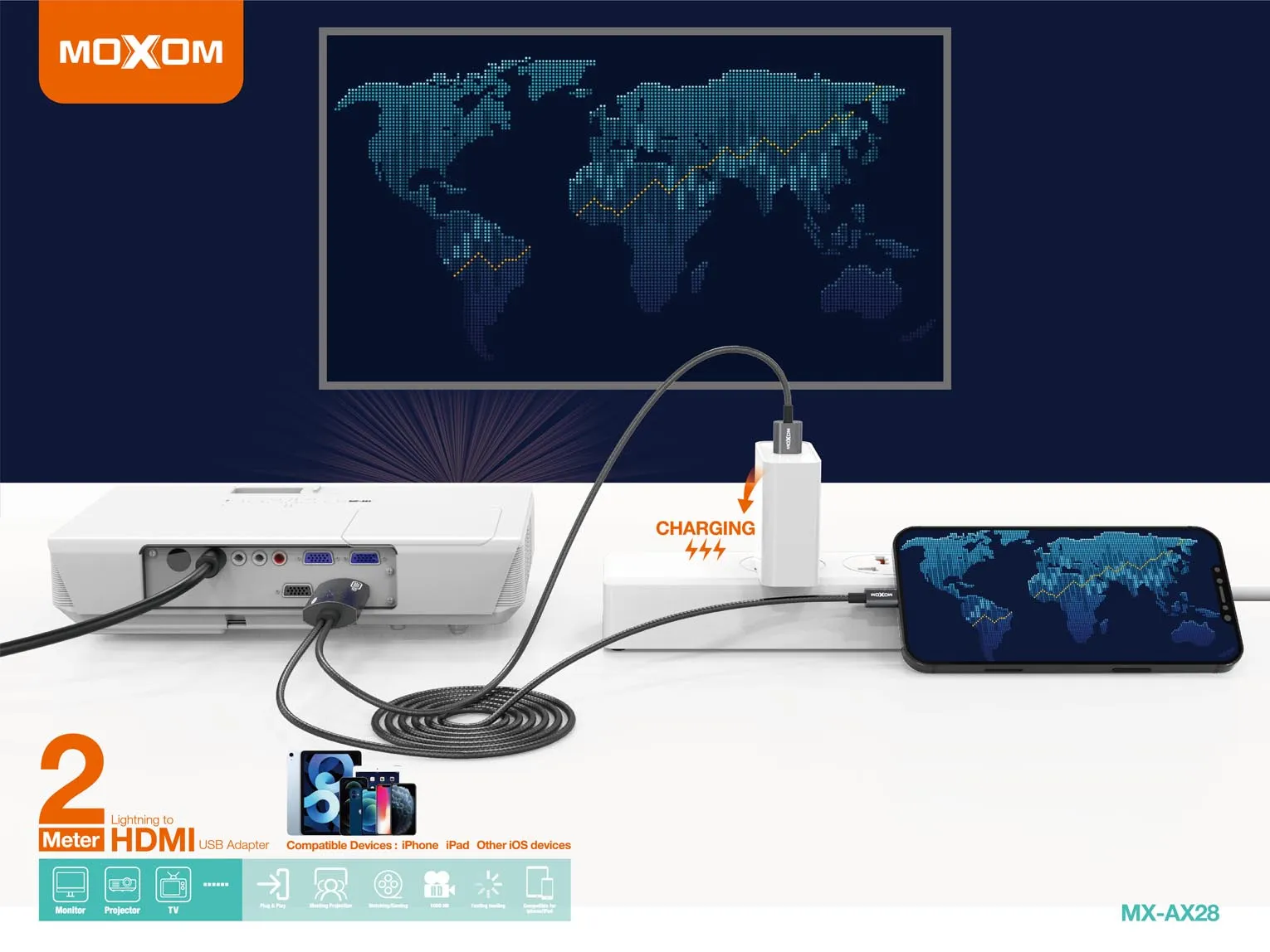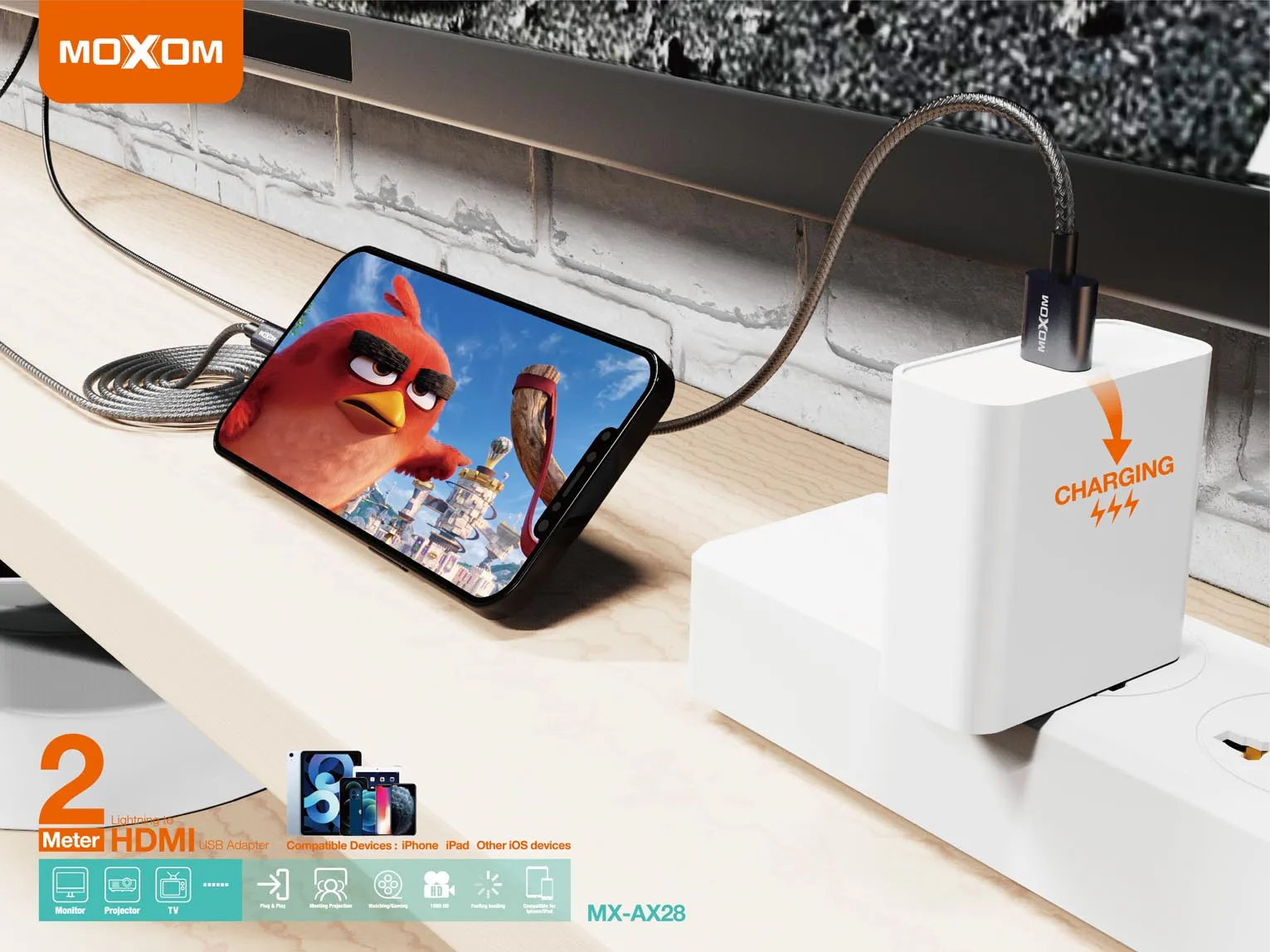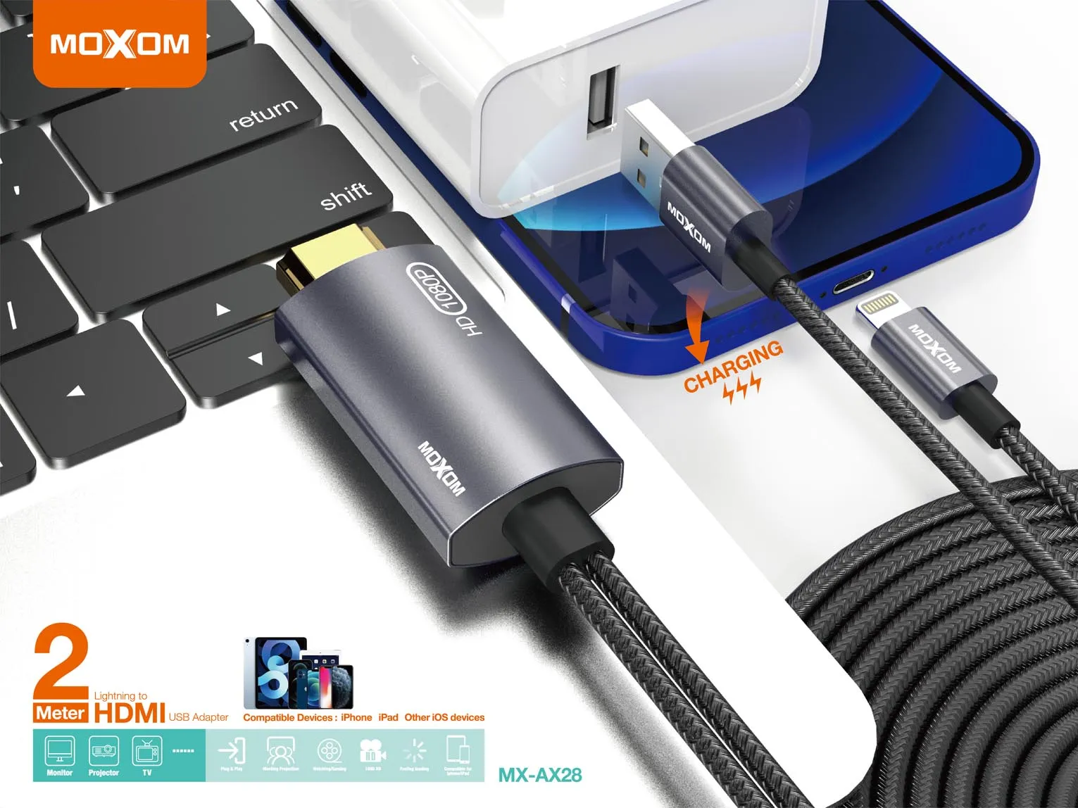 كابل وتحويلة MOXOM MX-AX28 HDMI إلى آيفون بطول 2 متر – نقل صورة فائقة الجودة مع خاصية الشحن