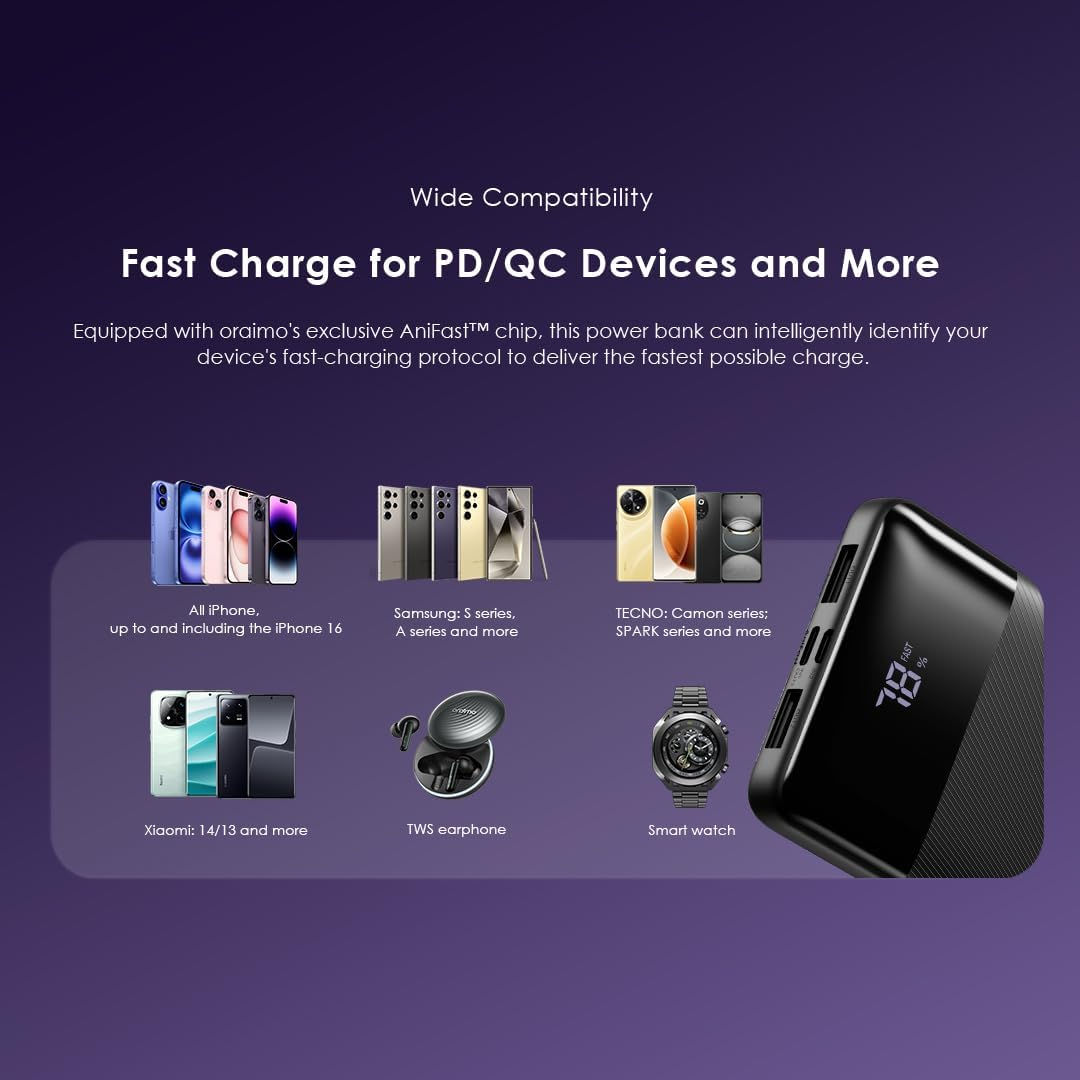 يحتوي على منفذ تايب-سي ثنائي الاتجاه للشحن وإعادة الشحن بسهولة، بالإضافة إلى شاشة LED ذكية تعرض سرعة الشحن ونسبة البطارية. ومع نظام الحماية المتعدد من أورايمو، يمكنك الاعتماد عليه لتجربة شحن آمنة ومستقرة أينما كنت.