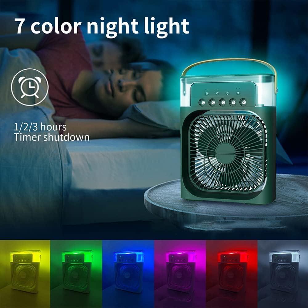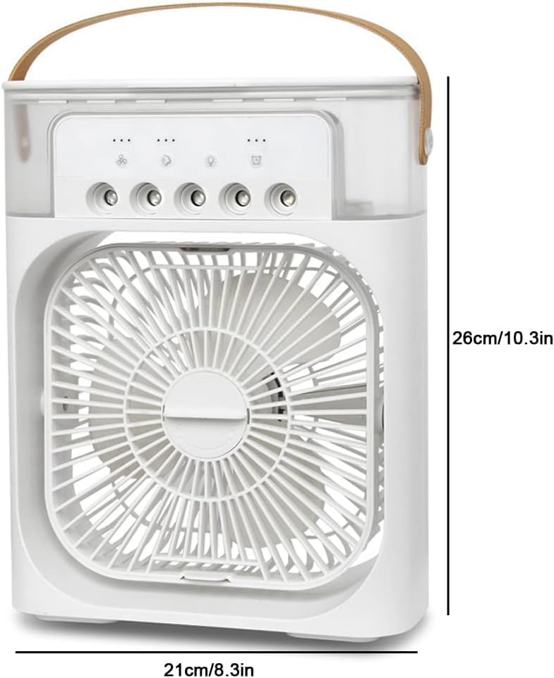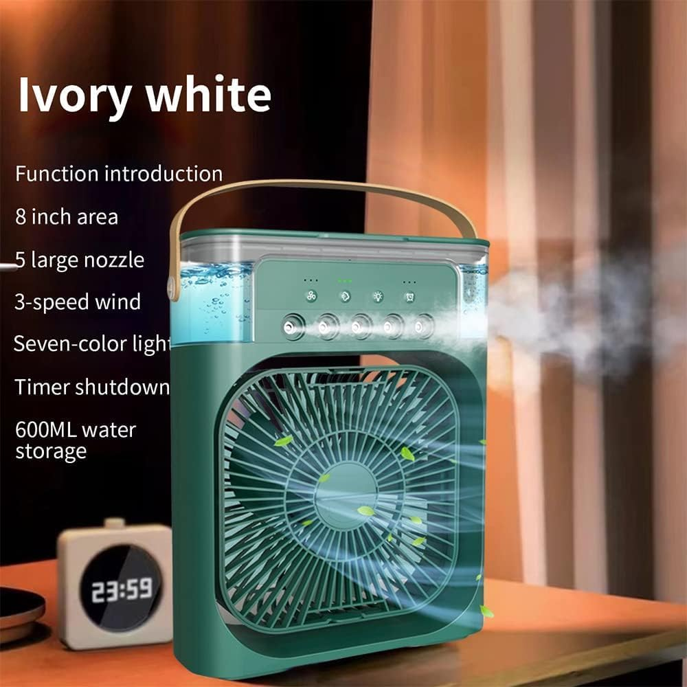 مبرد هواء محمول متعدد الوظائف 4 في 1 يجمع بين المروحة والترطيب ورذاذ الماء والإضاءة، مثالي للاستخدام الشخصي في المنزل أو المكتب.