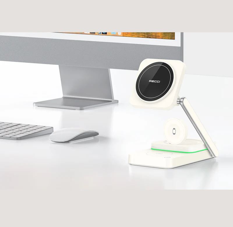 اشحن هاتفك، ساعتك الذكية، وسماعاتك اللاسلكية في نفس الوقت مع شاحن Recci RCW-48 اللاسلكي 3 في 1. تصميم أنيق قابل للطي، شحن مغناطيسي سريع، ونهاية لفوضى الكابلات.