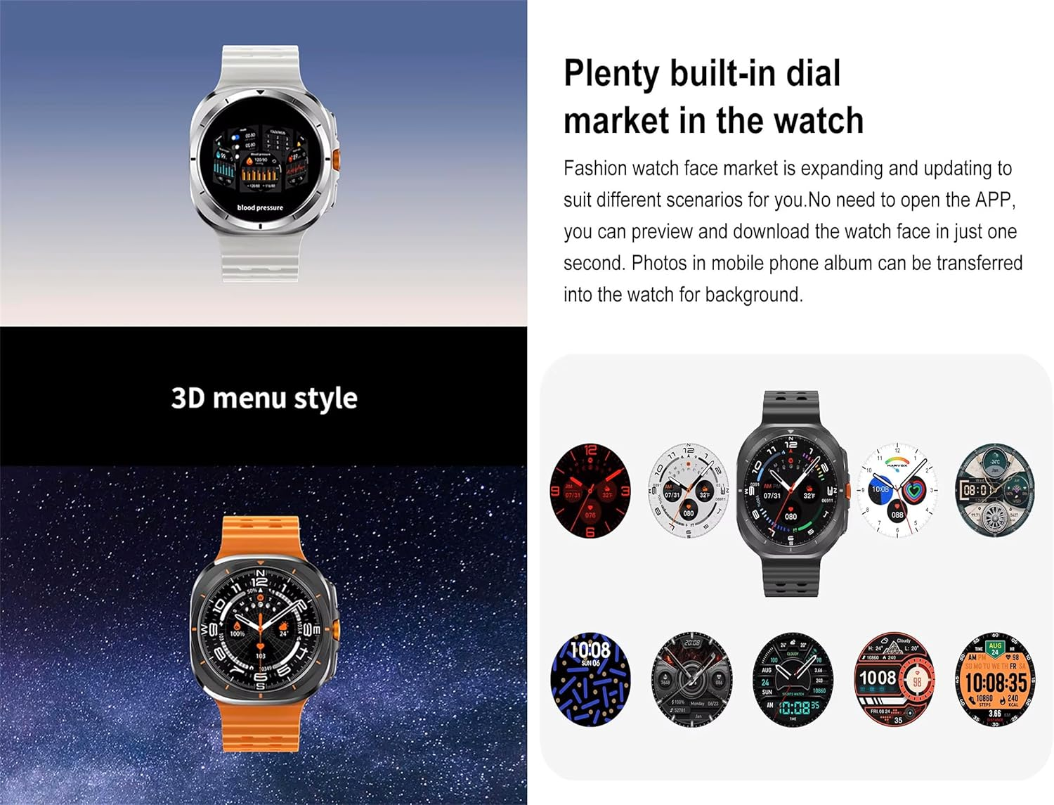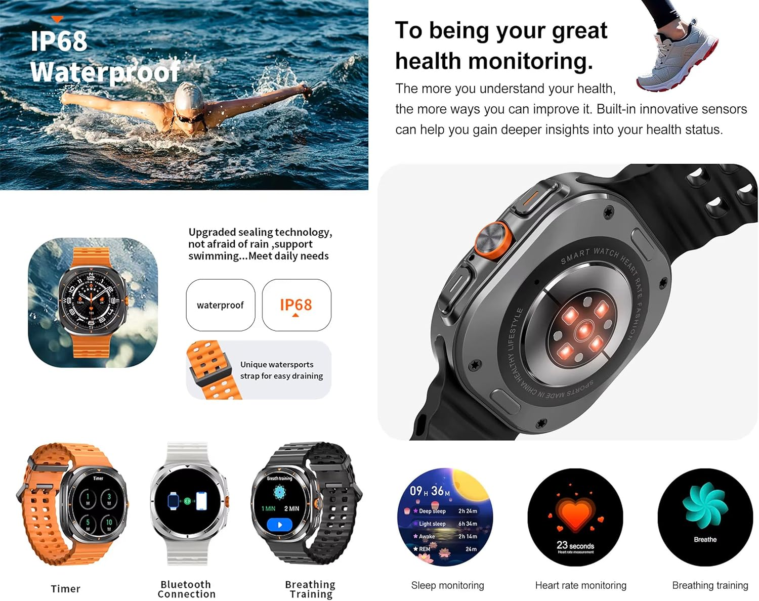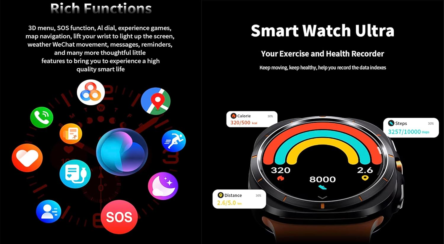 تجمع ساعة S7 Ultra pro Smart Watch بين التصميم المتطور والأداء العالي، فهي تأتي بهيكل قوي خلفي مزود بأربع براغي لتثبيت محكم وشاشة دائرية عالية الدقة بحجم 1.46 بوصة بدقة 360×360 بكسل. تدعم الساعة شريحتي بلوتوث 5.3 لثبات الاتصال وسلاسة التبديل بين الأجهزة، كما تحتوي على ذاكرة داخلية 4 جيجا لتخزين الملفات والتطبيقات.