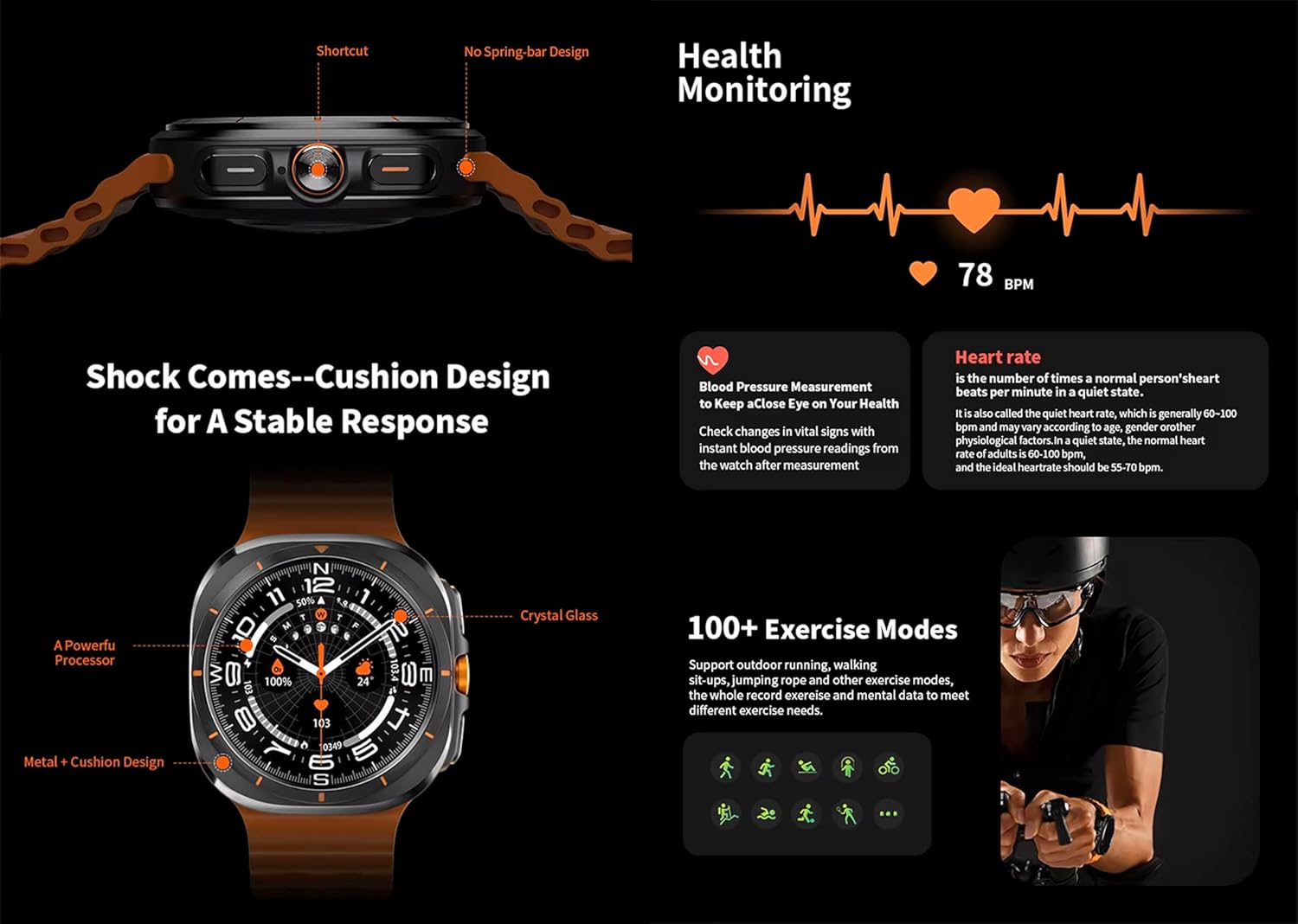 تتوافق الساعة مع أنظمة Android وiOS عبر تطبيق HD Fit Pro وتأتي مع سوارين باللون البرتقالي لمظهر رياضي عصري.