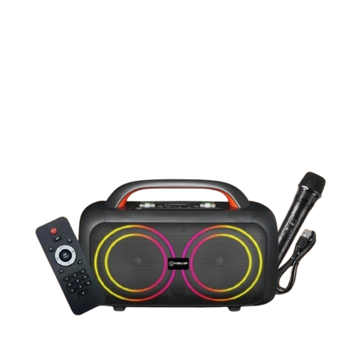 تدعم Bluetooth وUSB وFM، مع بطارية قوية 5400mAh تضمن تشغيل طويل بدون انقطاع. الإضاءة LED التفاعلية تضيف أجواء حماسية مع الموسيقى، ويجي معاها ميكروفون سلكي وريموت كنترول للتحكم الكامل.