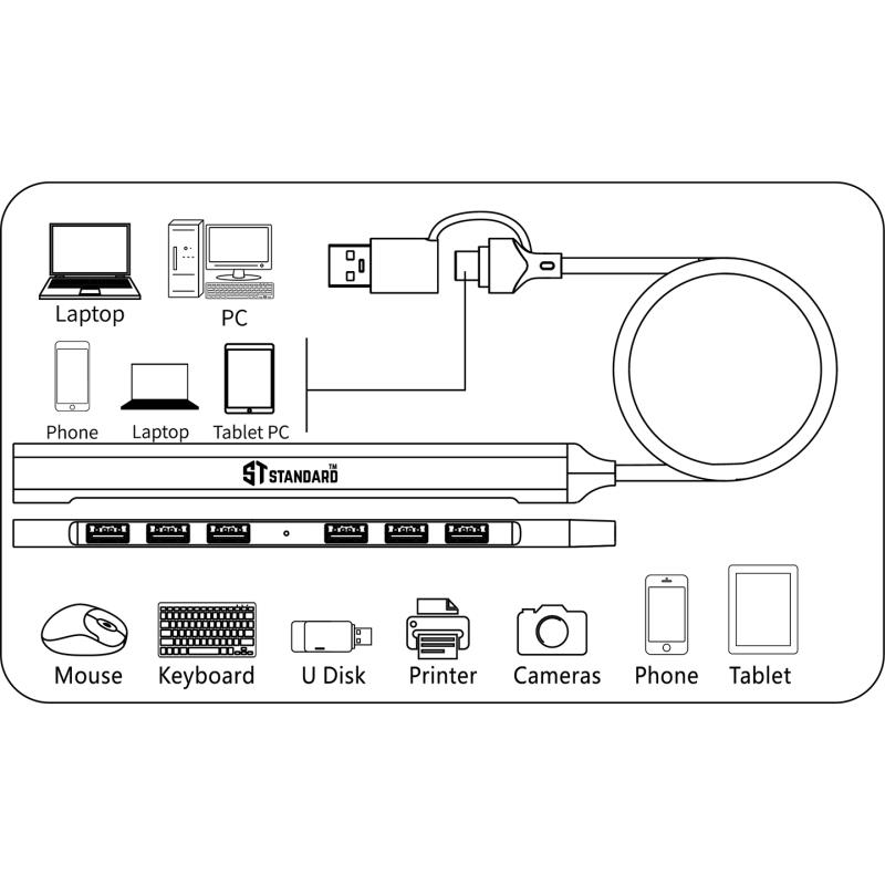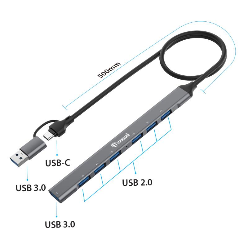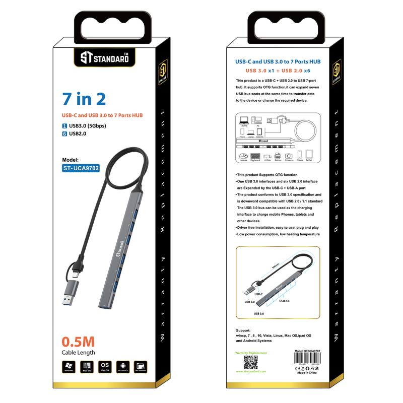 هاب USB-C + USB 3.0 بسبعة منافذ (7×2) موديل ST-UCA9702هاب ST-UCA9702 يمنحك توسّع كامل لجهازك من خلال سبعة منافذ USB في تصميم واحد أنيق وفعّال. يجمع بين منفذ USB 3.0 عالي السرعة وستة منافذ USB 2.0 لتوصيل كل أجهزتك في وقت واحد، مع دعم كامل لخاصية OTG والتشغيل الفوري دون أي برامج. تصميم قوي، أداء ثابت، وحل مثالي للعمل، اللعب، والنقل السريع للبيانات.