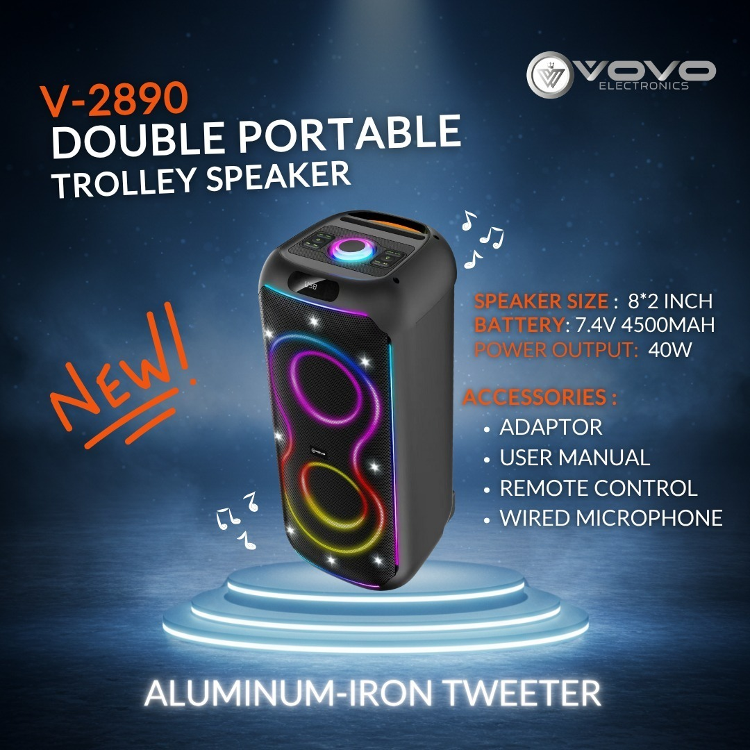 سماعة VOVO V-2890 ثنائية 8 بوصة بلوتوث للحفلات – 40 وات محمولة مع إضاءة LED وميكروفون-1532