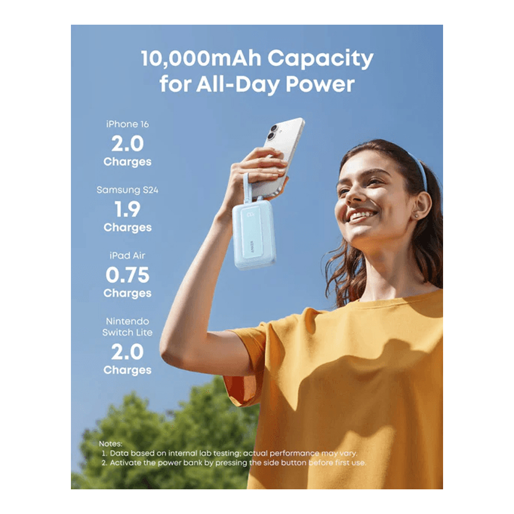 باور بانك Anker Zolo بسعة 10,000mAh مع كابلين USB-C مدمجين، شحن سريع بقوة 35 واط، وإمكانية شحن 4 أجهزة في نفس الوقت. تصميم خفيف ومثالي للسفر.