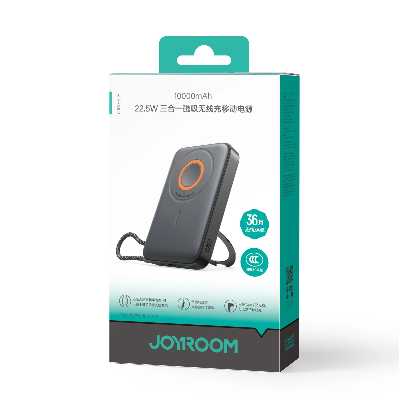 باور بنك Joyroom JR-PBM02 مغناطيسي 3 في 1 بسعة 10000mAh وشحن سريع 22.5W – أسودباور بنك Joyroom JR-PBM02 هو شاحن متنقل مغناطيسي 3 في 1 يوفر شحن سريع وعملي في أي وقت. يتميز بقوة شحن 22.5 واط، مغناطيس قوي بقوة 13N، ودعم كامل لجميع بروتوكولات الشحن السريع. يأتي بسعة حقيقية 10000mAh، وشحن لاسلكي حتى 15W، وكابل Type-C مدمج قابل للتمديد، مع تصميم نحيف وخامات مقاومة للخدش والحريق. مثالي لشحن جميع الهواتف بسهولة وأمان.