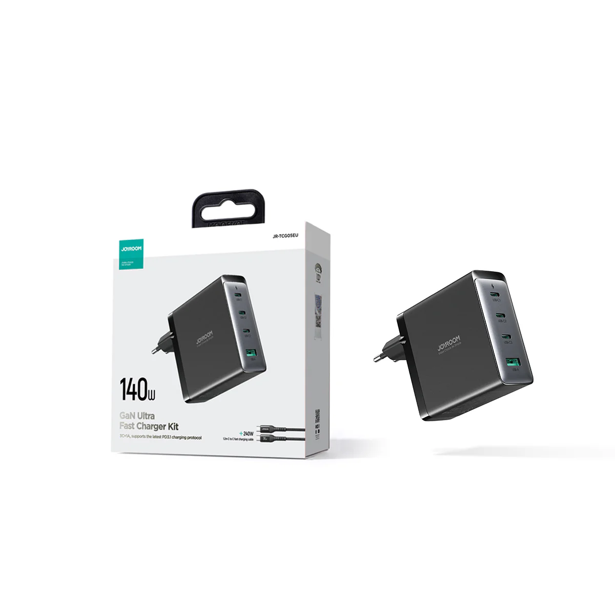شاحن JOYROOM JR-TCG05EU GaN 3C1A بقدرة 140 واط يجمع بين أحدث تقنيات شريحة GaN وكفاءة الشحن المتعدد. مزود بـ 4 منافذ (3 × USB-C + 1 × USB-A)، ويقدم قدرة إجمالية تصل إلى 140 واط مع دعم بروتوكولات الشحن السريع PD3.1 وPPS وQC3.0 وSamsung AFC وHuawei FCP/SCP. مثالي لشحن أجهزة اللابتوب، التابلت، والهواتف الذكية بمختلف العلامات التجارية، مع إمكانية شحن عدة أجهزة في نفس الوقت بكفاءة عالية.