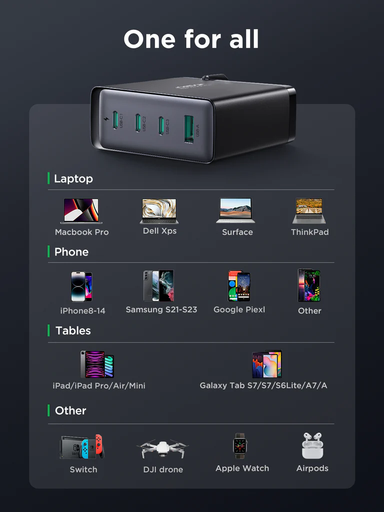 • 4 منافذ (3 × USB-C + 1 × USB-A) للشحن المتزامن.