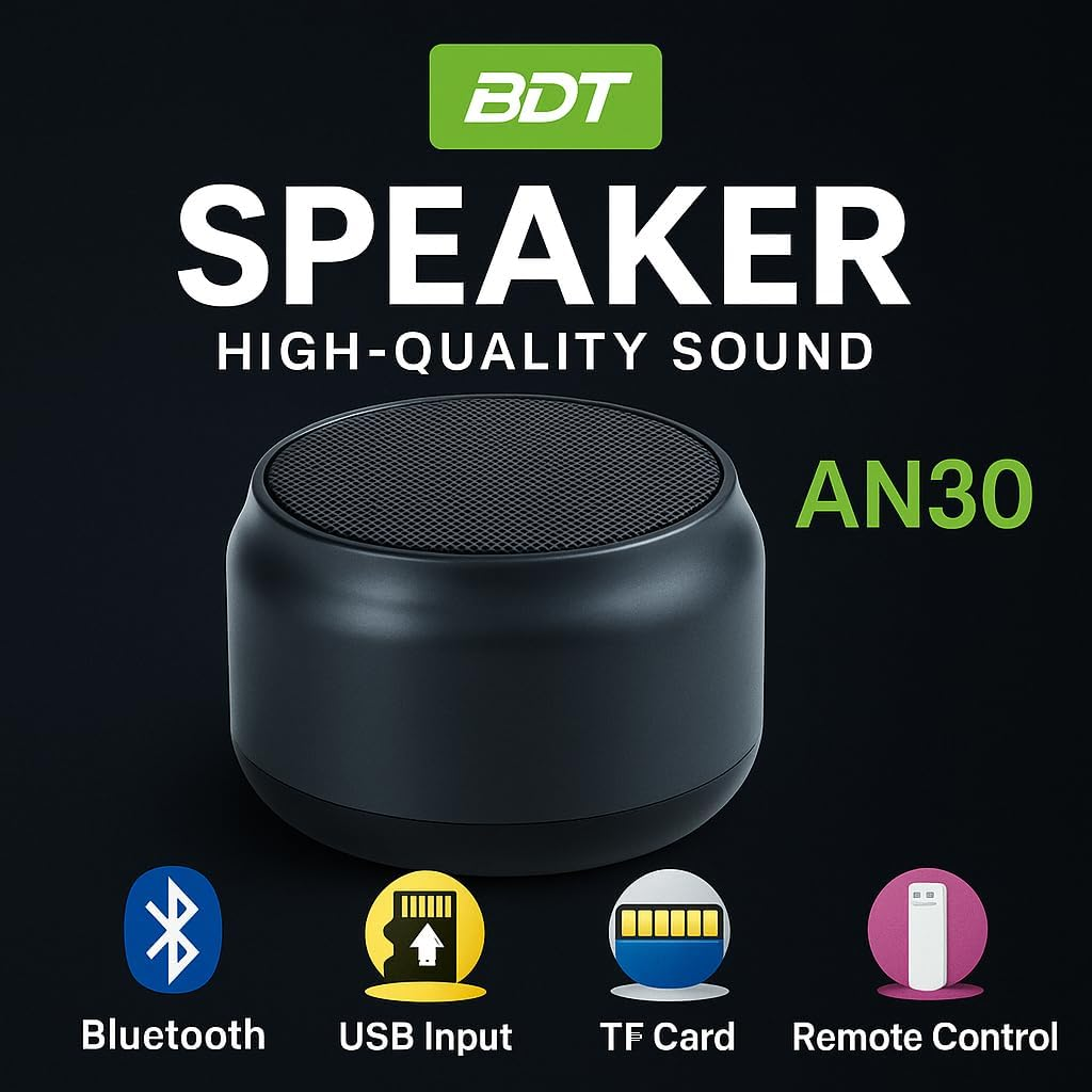 استمتع بالموسيقى في أي مكان مع BDT AN30 Portable Wireless Bluetooth Speaker. تقدم هذه السماعة الصغيرة صوت ستيريو واضح، واتصال بلوتوث مستقر، وخيارات تشغيل متعددة، مما يجعلها مثالية للاستخدام اليومي والسفر.