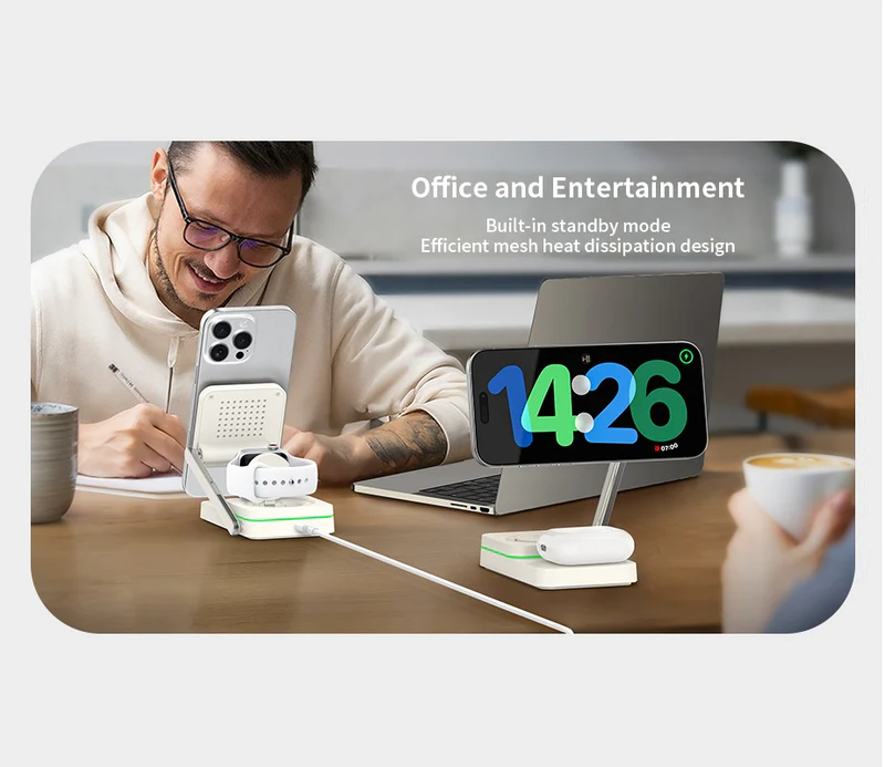 • شحن 3 في 1: شحن الهاتف (MagSafe)، الساعة الذكية، وسماعات الأذن في وقت واحد