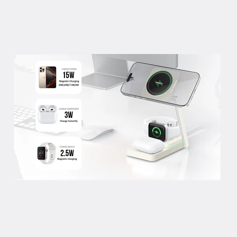 اشحن هاتفك، ساعتك الذكية، وسماعاتك اللاسلكية في نفس الوقت مع شاحن Recci RCW-48 اللاسلكي 3 في 1. تصميم أنيق قابل للطي، شحن مغناطيسي سريع، ونهاية لفوضى الكابلات.