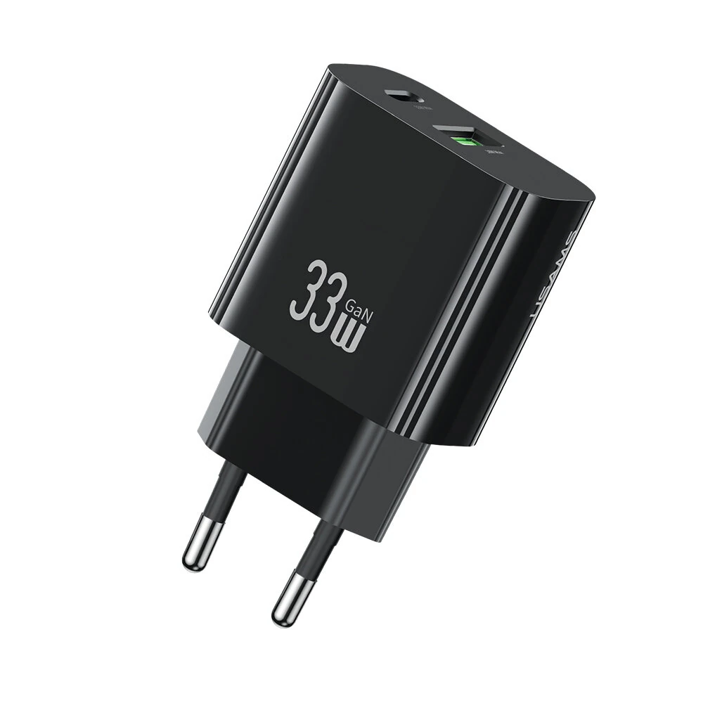 شاحن USAMS CC317 محمول GaN بقوة 33W – قابس EU، USB-A وType-C، أسود- 4951
