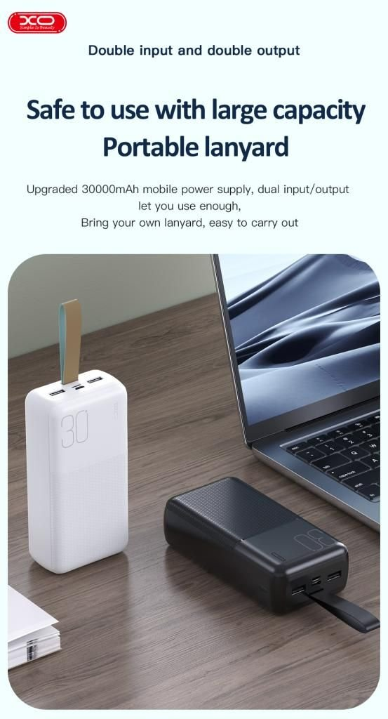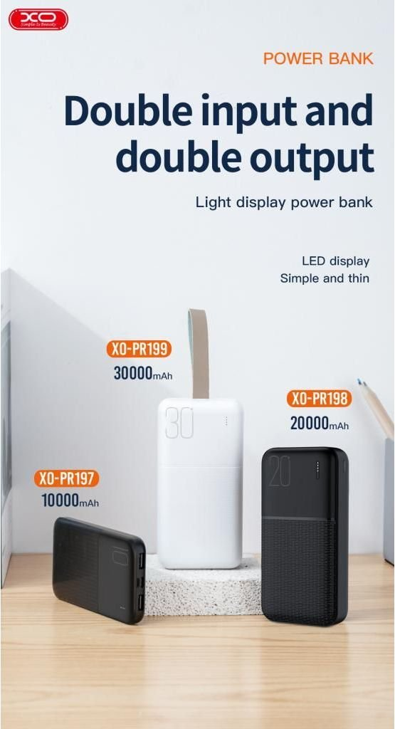 باور بنك XO PR199 بسعة 30000mAh يوفر طاقة كبيرة تكفي لشحن هاتفك أو جهازك الذكي عدة مرات، مع تصميم عصري ومؤشرات LED لعرض حالة الشحن، ومنافذ متعددة تناسب مختلف الأجهزة.
